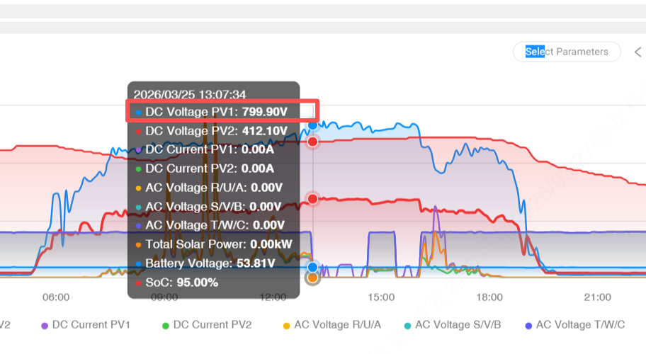 - 근본 원인: PV1 스트링에 직렬로 연결된 모듈이 너무 많아서 개방 회로 전압이 인버터를 크게 초과합니다. ' s MPPT 또는 DC 입력 제한. 스크린샷은 일반적인 안전 한계를 훨씬 초과하는 799.90V를 보여줍니다.